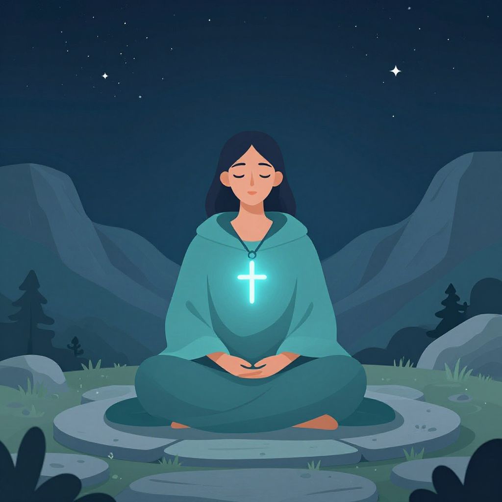 Digital illustration of a serene woman with closed eyes, wearing a teal hoodie and green pants, sitting cross-legged under a starry night sky, glowing cross