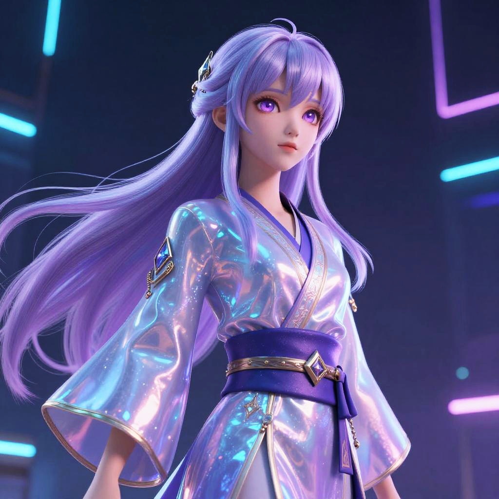 3D anime digital mage with neon lavender hair in holographic robe within cyberspace realm in a cinematic scene