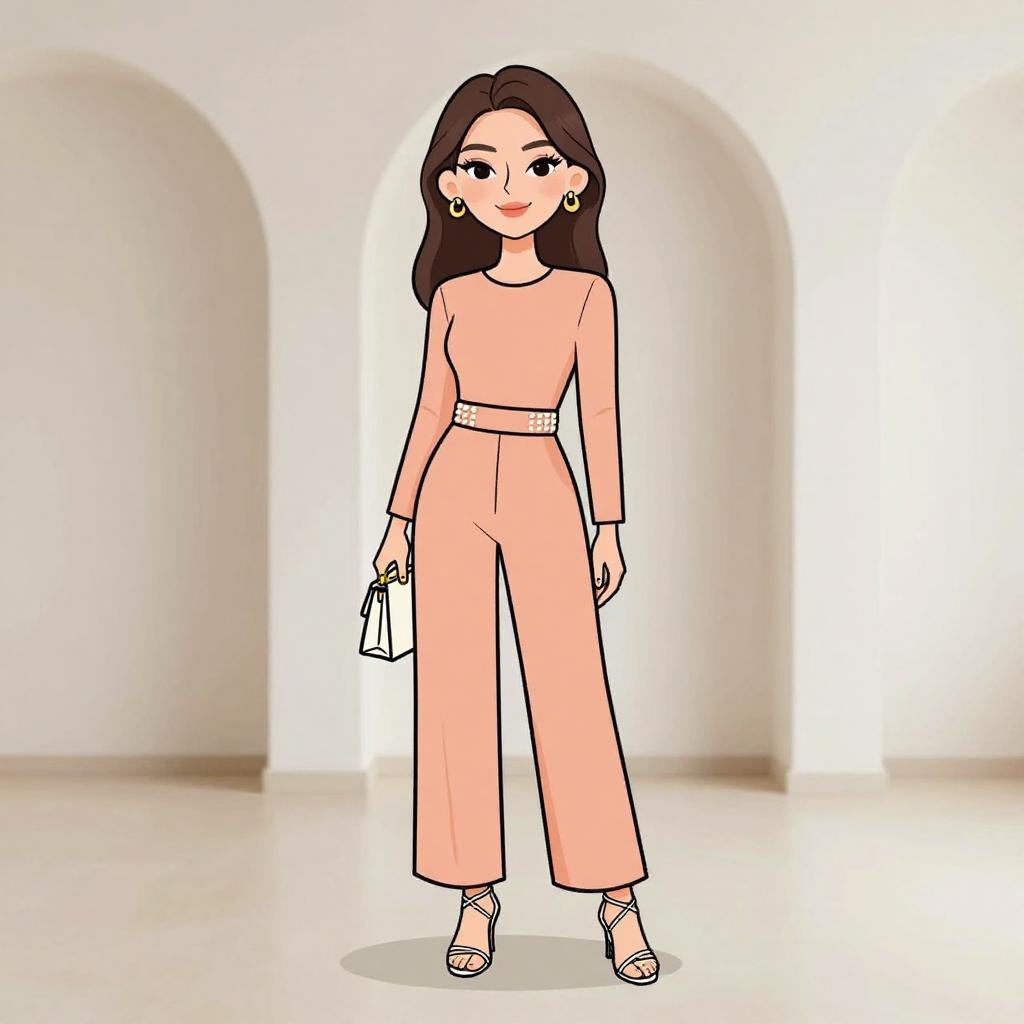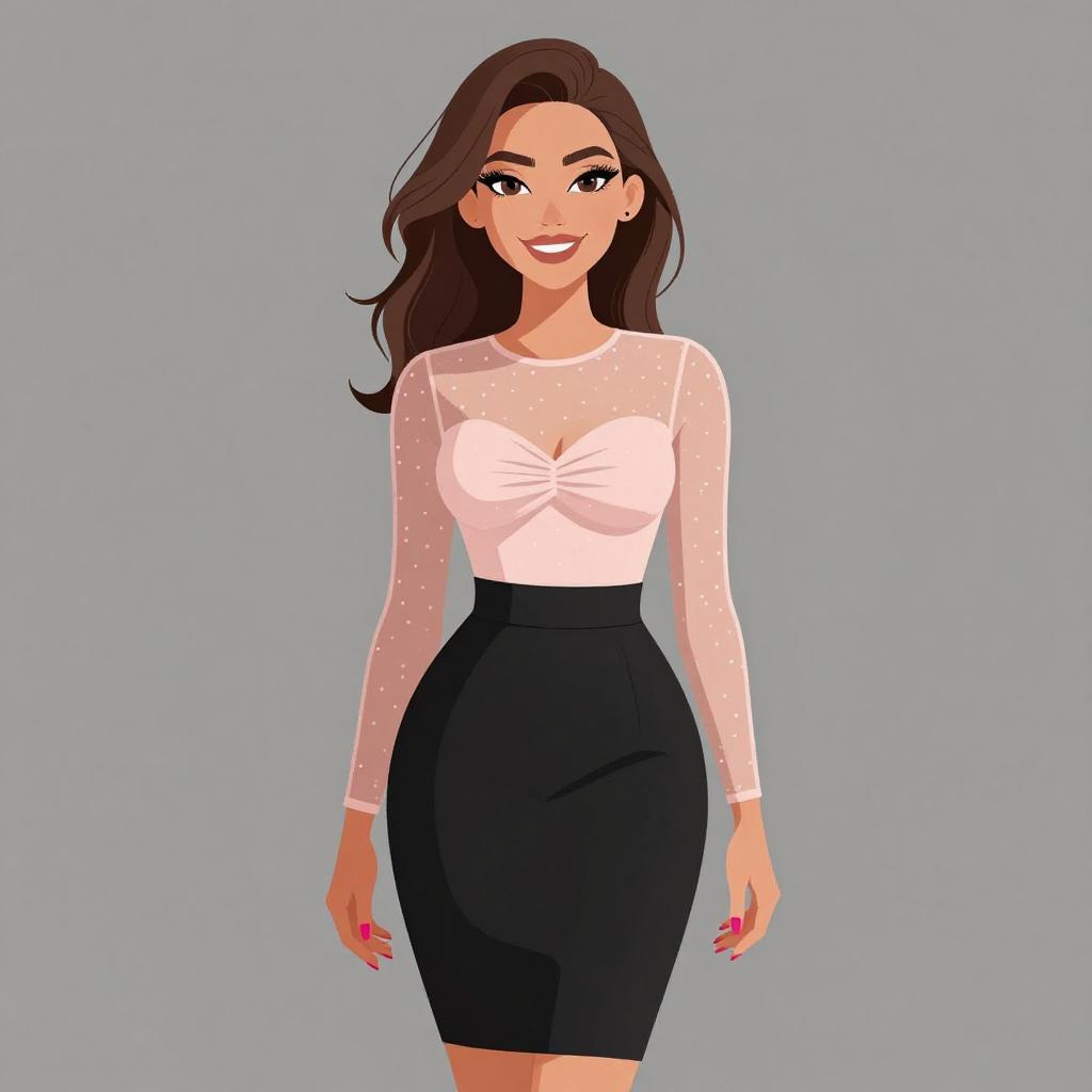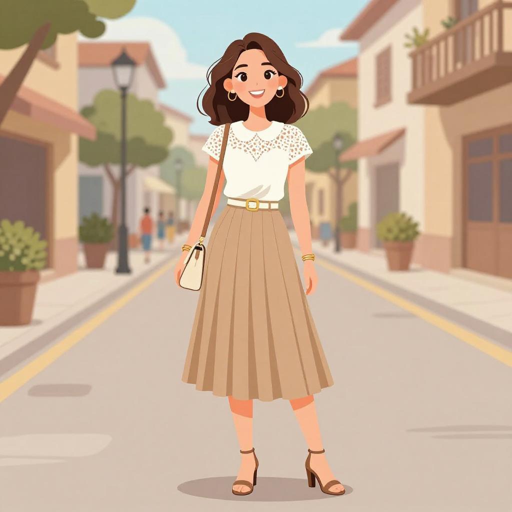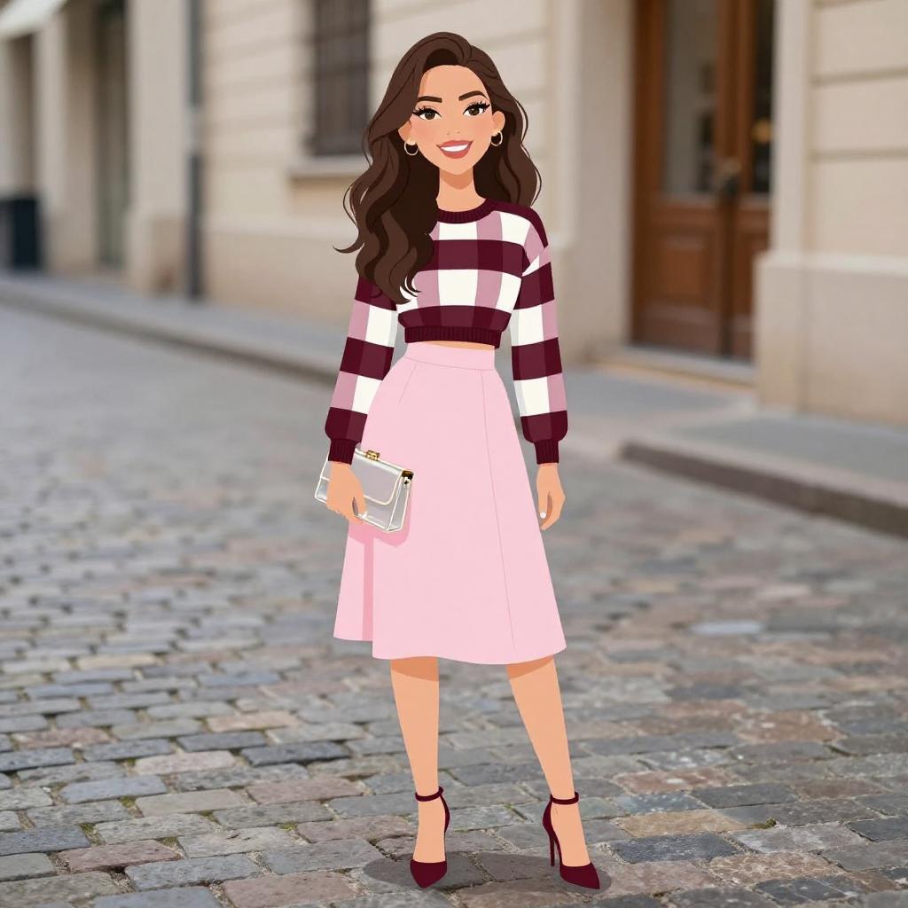 Woman with pretty face and pretty hair. smiling Woman, modern preppy, burgundy and white windowpane-check cropped sweater, high-waisted pale pink A-line skirt, knee-length, burgundy ankle strap high heels, clear acrylic clutch with metallic closure, wavy long hair, cobblestone street background --sref 1467