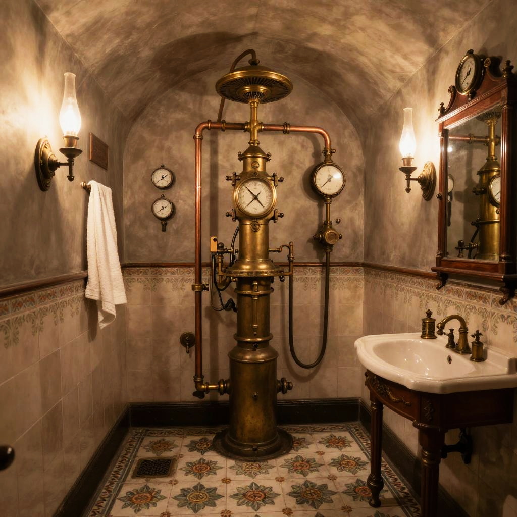 Victorian steampunk bathroom scene with a high vaulted ceiling, mechanical steam-powered shower system, brass and copper plumbing exposed artistically, tiled floor with Victorian floral patterns, vintage steam gauges on walls, flickering gaslight sconces, and an ornate wooden washbasin.