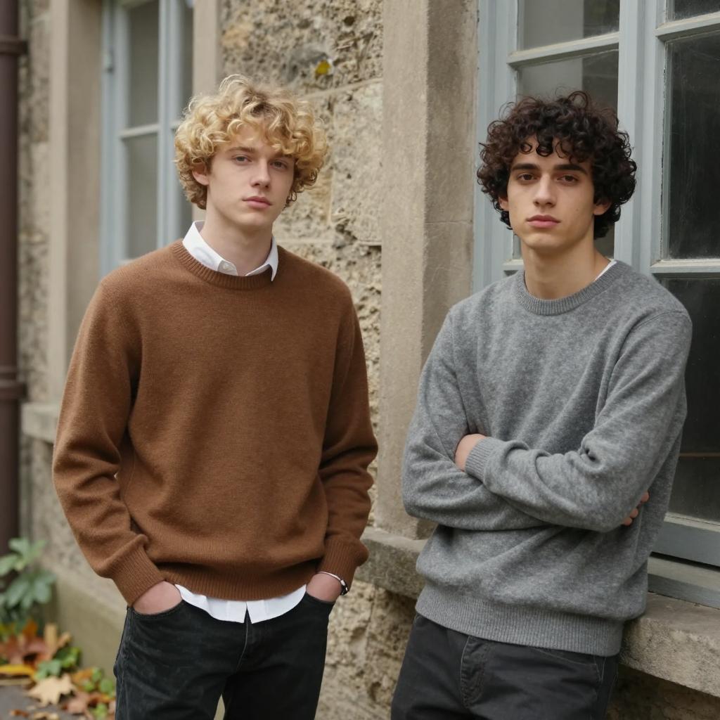 Two young men with close facial profiles, intense eye contact, and focused expressions. The man on the left has blond hair, light skin, and wears a white sweater with dark and light blue stripes. The man on the right has dark brown hair, light skin, and wears a blue shirt. Their foreheads nearly touch. White background.