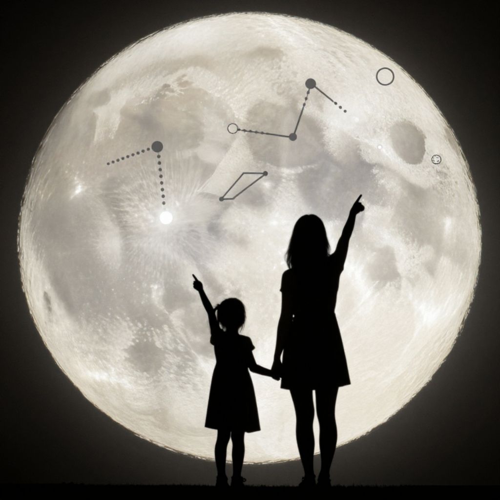 Silhouettes of a woman and child stand hand-in-hand against a luminous full moon, their figures outlined by the celestial glow as they point to constellations marked by dotted lines and circles across its surface.