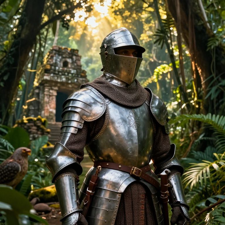 Photograph of a medieval armored knight in shining silver armor, helmeted, standing in a lush, sunlit jungle with ancient stone ruins and a bird
