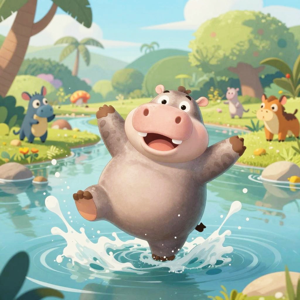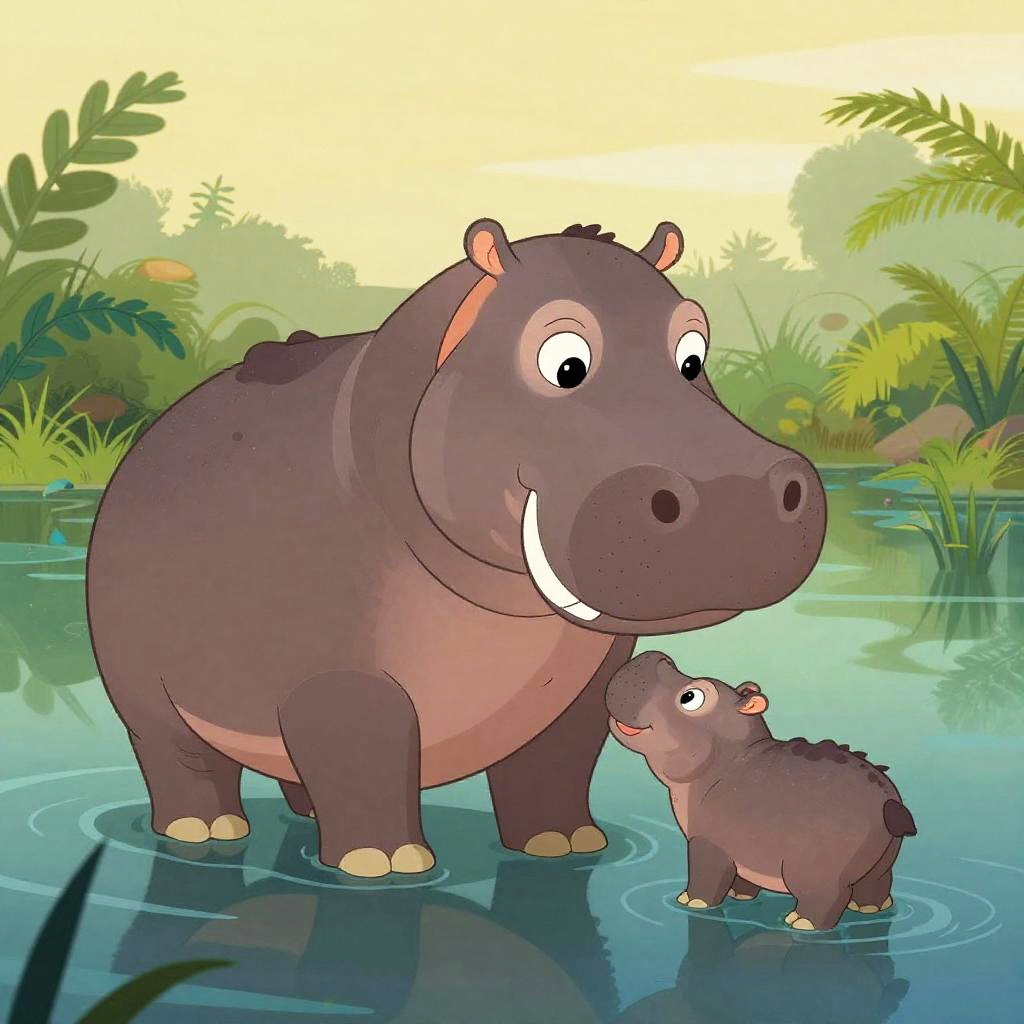 Charming hippo animation of a mother hippo caring for her playful calves in a serene swamp, with smooth character design, gentle water reflections, and animated foliage swaying gently in the breeze, rendered in a warm, inviting art style.