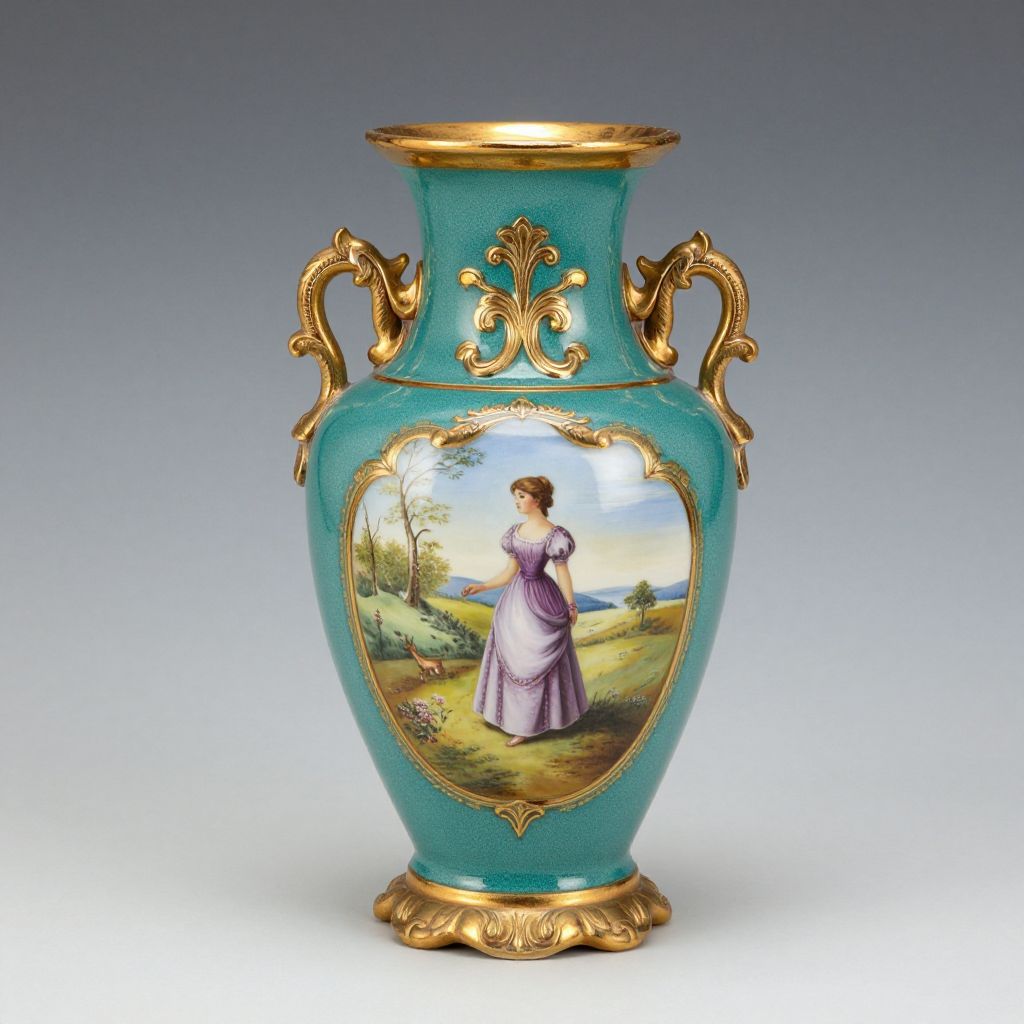 Ornate turquoise porcelain vase with gold accents, featuring a painted scene of a woman in a purple dress standing in a lush countryside.