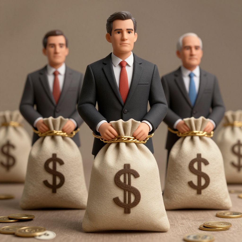 Photorealistic digital image of three men in dark suits with red and blue ties, standing in front of beige sacks filled with money and marked with dollar signs. The central man has short black hair, a serious expression, and holds a sack with both hands. The men are slightly out of focus in the background, with scattered gold coins on the floor. The background is a plain, neutral gray, emphasizing the men and sacks. The men's skin tones are light, and they are positioned in a row, creating a sense of unity and focus on financial themes.