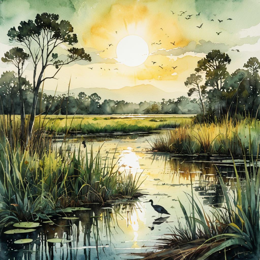 Watercolor painting of a misty marshland with reeds and lilies, featuring soft greys and muted greens, with subtle watercolor washes, serene and calming aesthetic