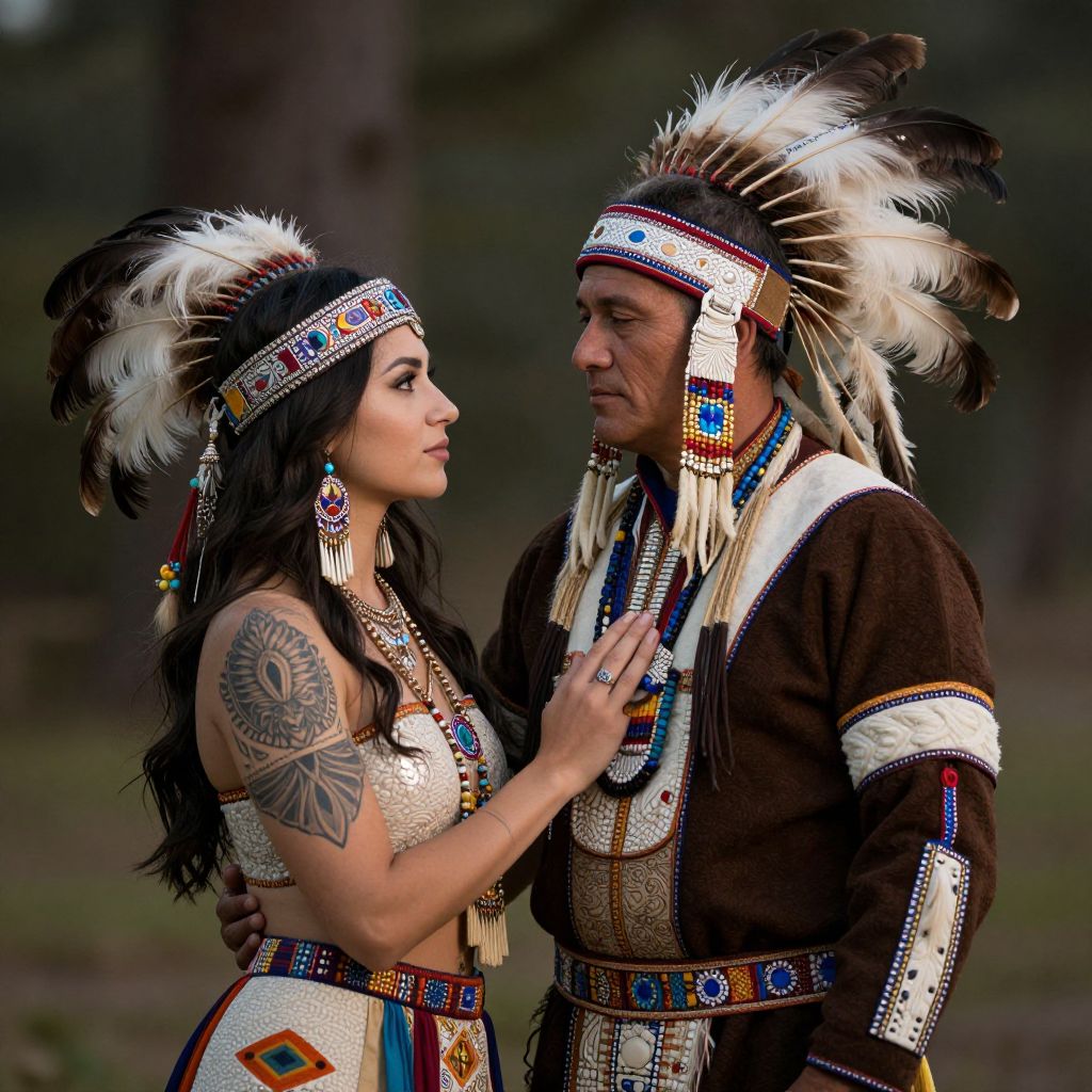 In this stunning, hyper-realistic outdoor scene, a couple stands side by side, exuding an air of elegance and grace. The woman, adorned with intricate headgear and a delicate necklace, sports a striking tattoo on her arm, while the man, dressed in a traditional Native American outfit with elaborate beadwork and feathered headdress, radiates a sense of pride and culture. The background, though blurred, hints at a natural setting, possibly a forest, with diffuse lighting that enhances the depth of field and cinematic feel. The image is captured with a 55mm lens at f/8, ISO 100, and a shutter speed of 1/125, resulting in a sharp-focus and exquisite detail. The lighting is meticulously crafted, with real lighting and cinematic lighting techniques creating a harmonious blend of natural and artificial light. The overall composition is balanced, with the couple positioned centrally, drawing the viewer's eye to their interlocked gazes and the intricate details of their attire. The scene is a testament to the power of hyper-realistic photography, capturing the beauty and intricacy of the subjects and their surroundings in a way that is both visually stunning and emotionally resonant.
