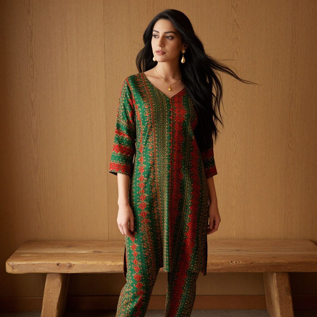 Photograph of a young woman with long, dark brown hair standing against a plain, beige wooden wall. She is wearing a traditional, knee-length, green and red patterned tunic with short sleeves, adorned with intricate embroidery. Her pants are matching, and she accessorizes with simple gold jewelry, including a necklace and earrings. Her expression is calm, with a slight smile, and she gazes to the left. A rustic wooden bench is positioned behind her, adding a natural texture to the scene. The lighting is warm, highlighting the rich colors of her attire.