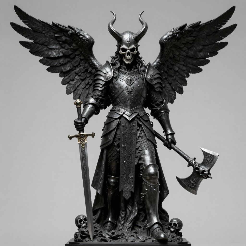 Black gothic sculpture featuring a menacing winged warrior with a horned skull helmet, clad in detailed armor and a long coat. The warrior holds a large sword and an ornate axe, with skull motifs on the weapons and armor, set against a neutral background.