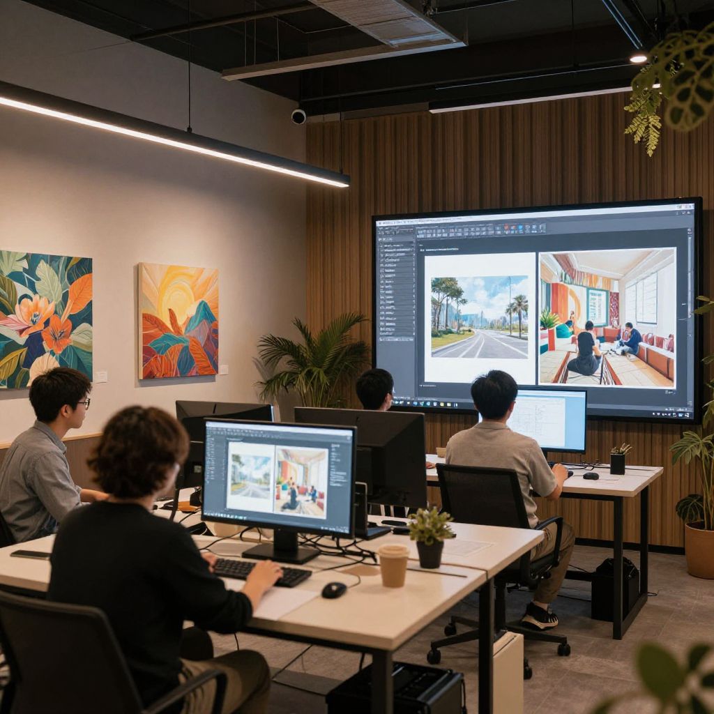 Photograph of a modern, well-lit office room with four people, three men and one woman, working on computers. The room has wooden walls, two colorful floral paintings on the left, and a large screen displaying a presentation of an interior design project on the right. The people are seated at white desks with black chairs, each with a monitor showing similar images. A potted plant is on the right side of the image, and a small plant sits on one desk. The room has a sleek, contemporary design with exposed ceiling ducts and ambient lighting.