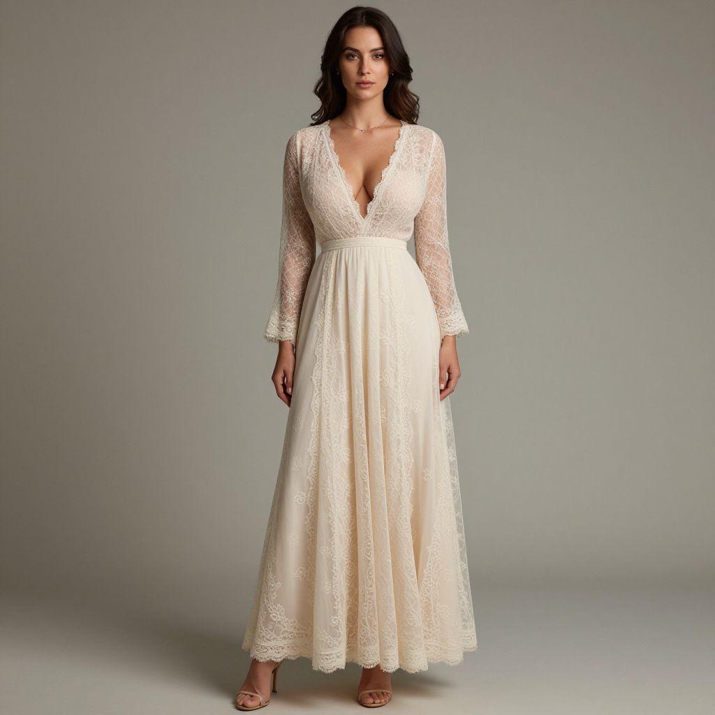 Full body shot, lean woman, elegant plunging neckline, intricate lace overlay, fitted bodice, flowing A-line skirt, sheer long sleeves, delicate scalloped edges, soft ivory color, lightweight breathable fabric, subtle floral patterns, cinched waist, ankle-length hem, paired with strappy heels, minimalistic silver jewelry, soft waves hairstyle, natural makeup, romantic ambiance Sexy. Pretty face and beаutiful eyes. Big breasts