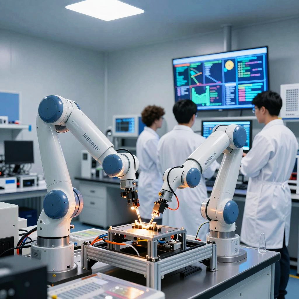 ECR advanced robotics laboratory, humanoid robots assembling with precision, scientists analyzing data on holographic screens, sterile environment illuminated by soft blue ambient light, high-tech machinery, focus on innovation and technology