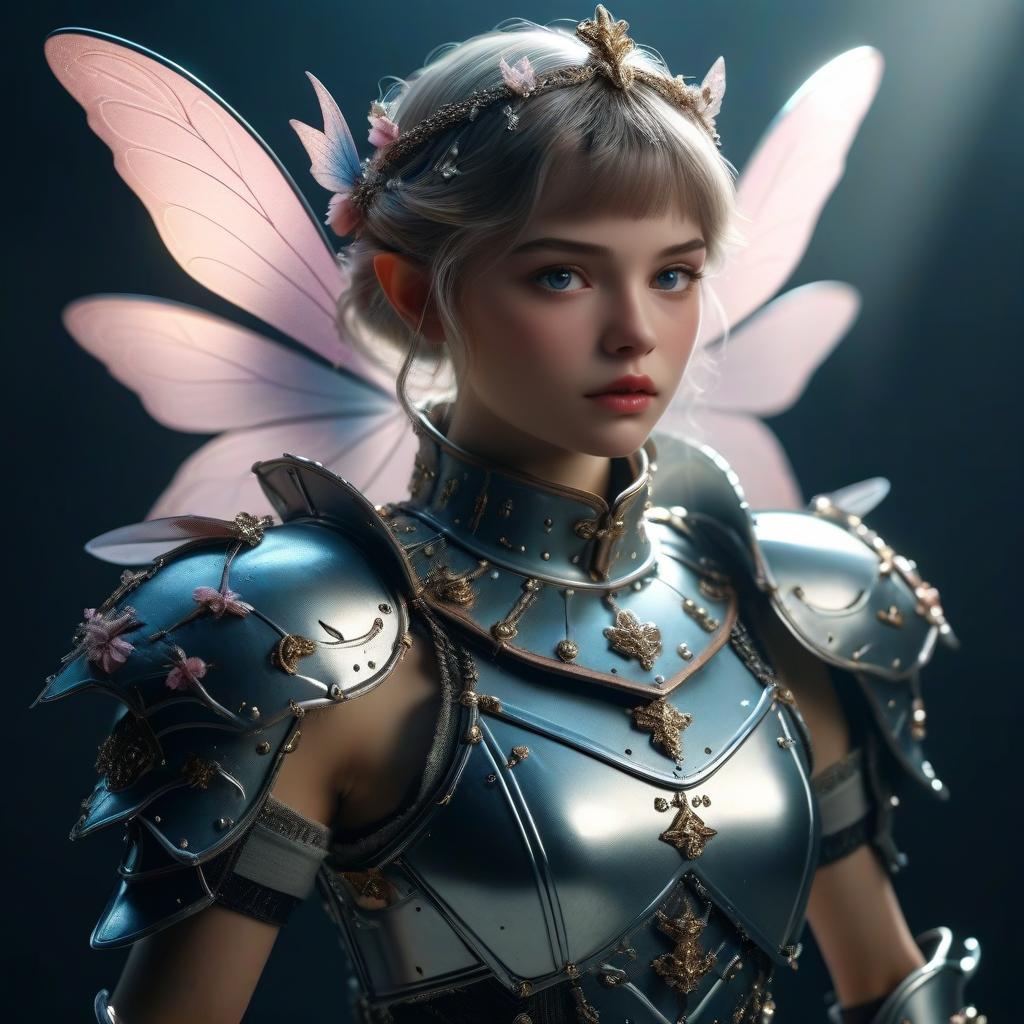 Playful fairy wearing Chanel armor, luxury materials, cinematic and professional studio lighting, sharp focus, 4K.