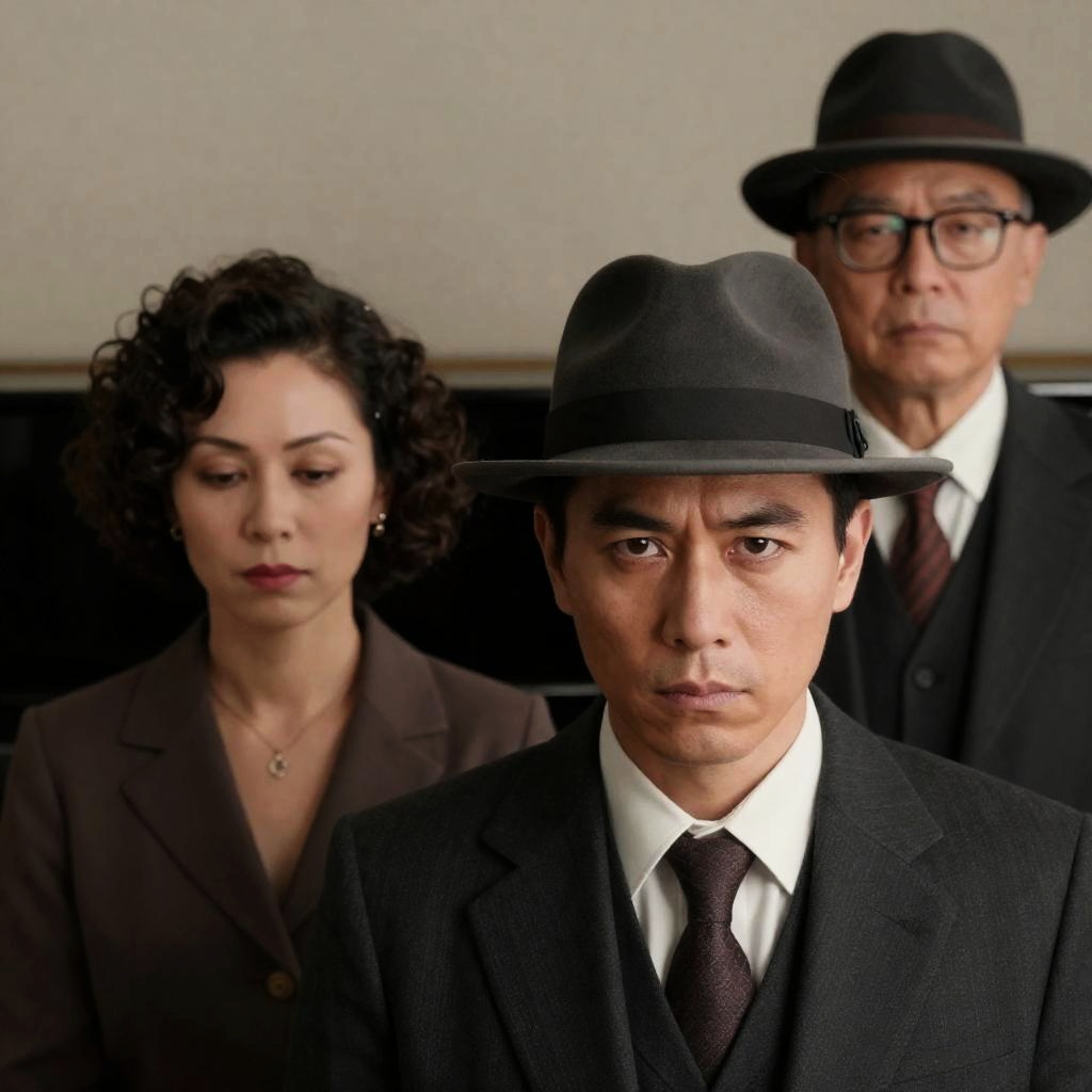Photograph of three men standing outdoors near a chain-link fence. Man on left with gray hair, brown coat, intense gaze. Middle man bald, serious expression, black suit, white shirt, black tie. Man on right with thinning hair, gray coat, white shirt, focused expression. Background includes fence, dim lighting.