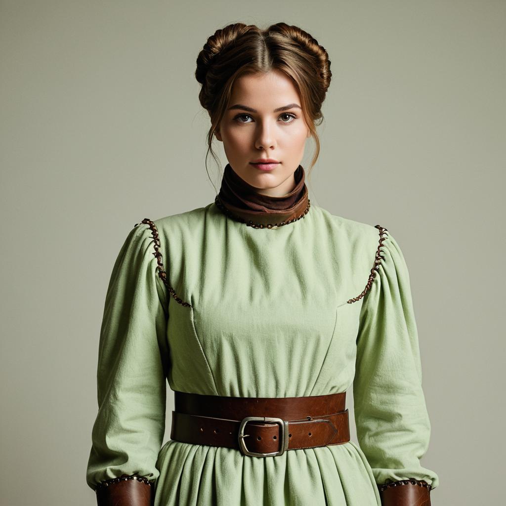Costume modern, photograph of a young woman in a historical, medieval-style outfit, light green long-sleeve dress with brown leather accents, high collar, brown belt with buckle, long sleeves with puffed shoulders, light brown hair in a loose updo, serious expression, neutral background, natural light, soft shadows, full body shot, realistic style