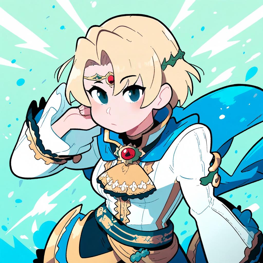 Alfred (fire emblem), fire emblem, 1boy, green eyes, blonde hair, short hair, blue cape, long sleeves, yellow ascot, circlet, by artist scott malin, animagine