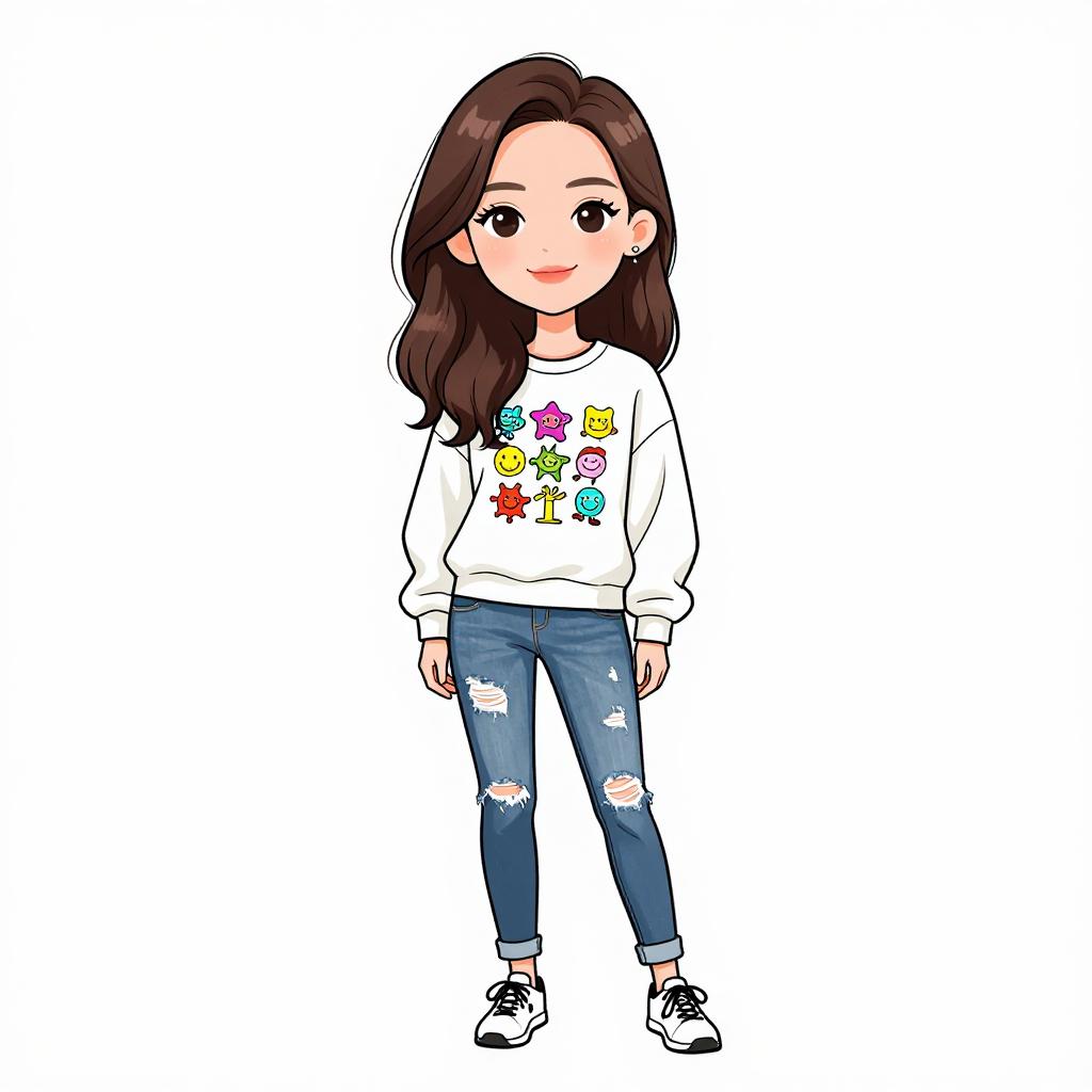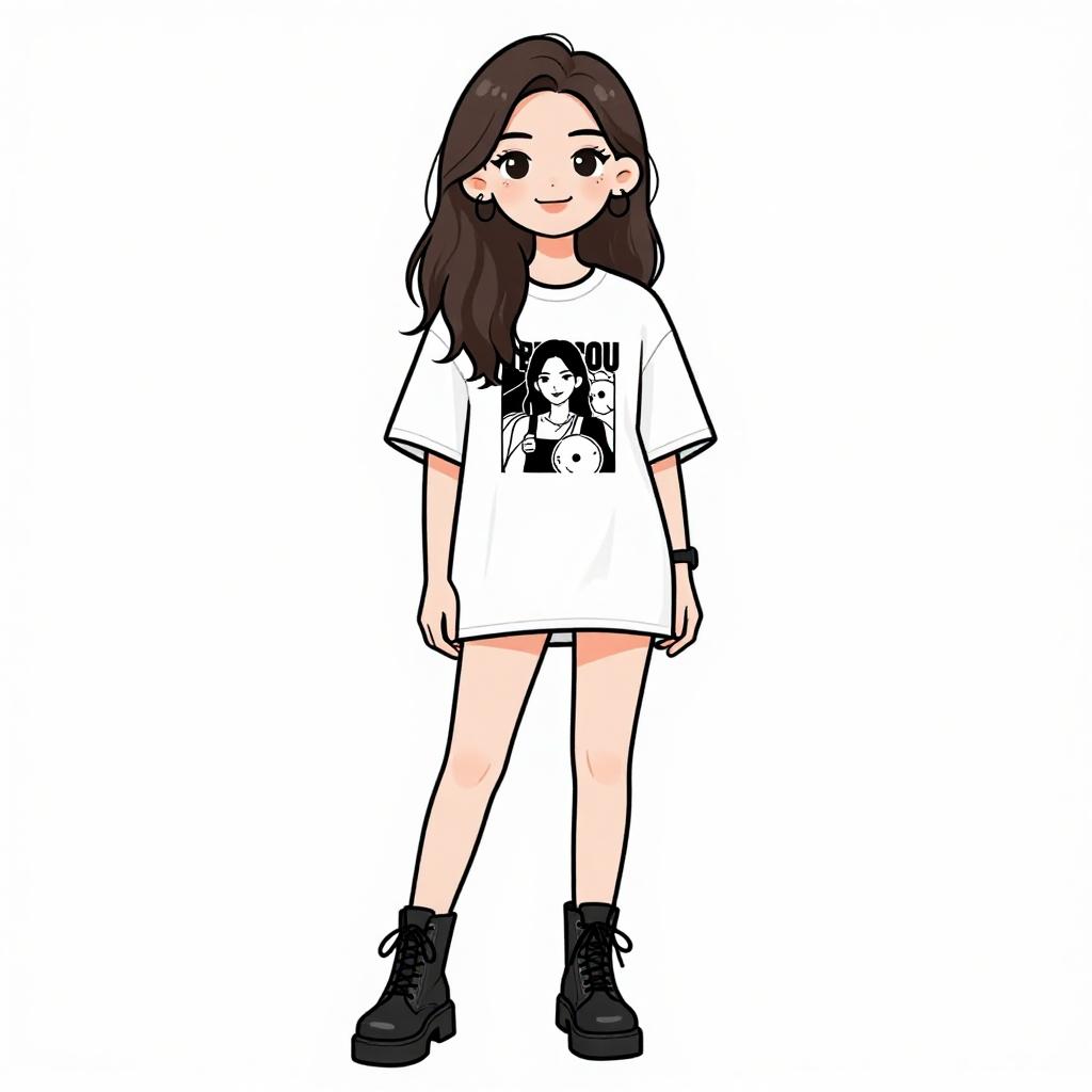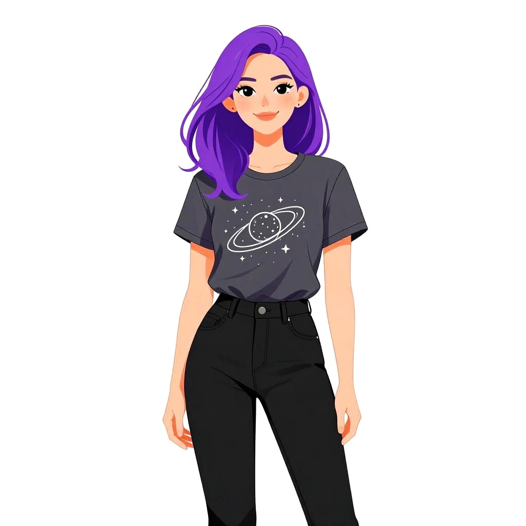 Woman with pretty face and pretty hair. smiling Woman, casual geek chic, oversized graphic t-shirt with robotic and cosmic print, short sleeves, navy blue accents on the shoulders and sleeves, thigh length, black platform ankle boots, solid color, white background. --sref 1467