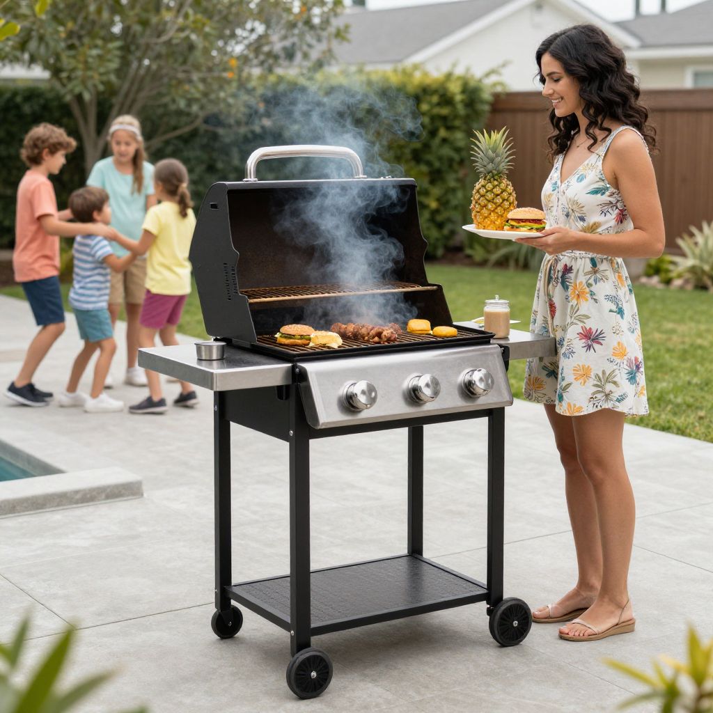 A realistic daylight shot of a black stainless steel grill positioned on a modern concrete deck, with a family gathered around it—children playing in the background and a mother with dark wavy hair and a floral dress standing nearby, holding a fresh pineapple and a burger on a plate, grill emitting warm steam.