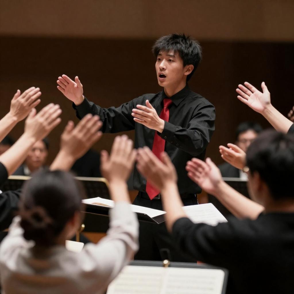 Young Conductor Under Stage Lights, Reaching Hands