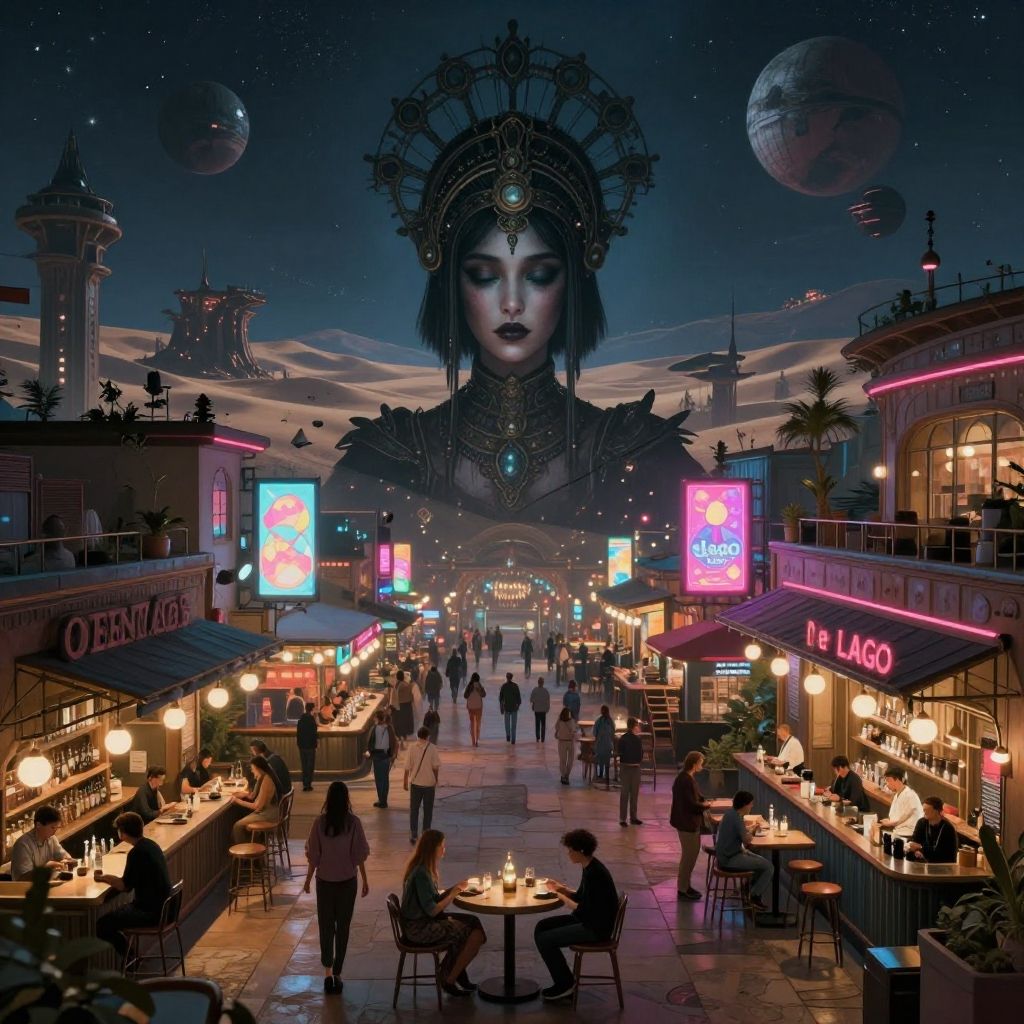 A digital art image depicts a futuristic, neon-lit market street at night. A large, stylized, dark-skinned woman with intricate headdress and closed eyes looms in the background. The street is filled with people sitting at round tables, dining at brightly lit restaurants labeled "O'CEANIA" and "LE LAC." Neon signs in pink and blue illuminate the scene. The sky is dark, with floating planets and a distant spaceship. The overall style is a blend of cyberpunk and fantasy, with detailed, vibrant colors and a mix of modern and mystical elements.