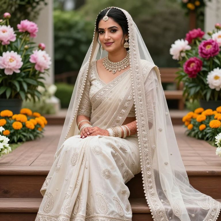 A high-resolution photo of a North Indian wedding look featuring a modern twist – a bride wearing a semi-sheer ivory sari with paisley patterns and a structured veil, her face glowing with natural makeup and a serene smile, seated on a wooden step in a garden-style wedding venue with peonies and marigolds blooming in the background.