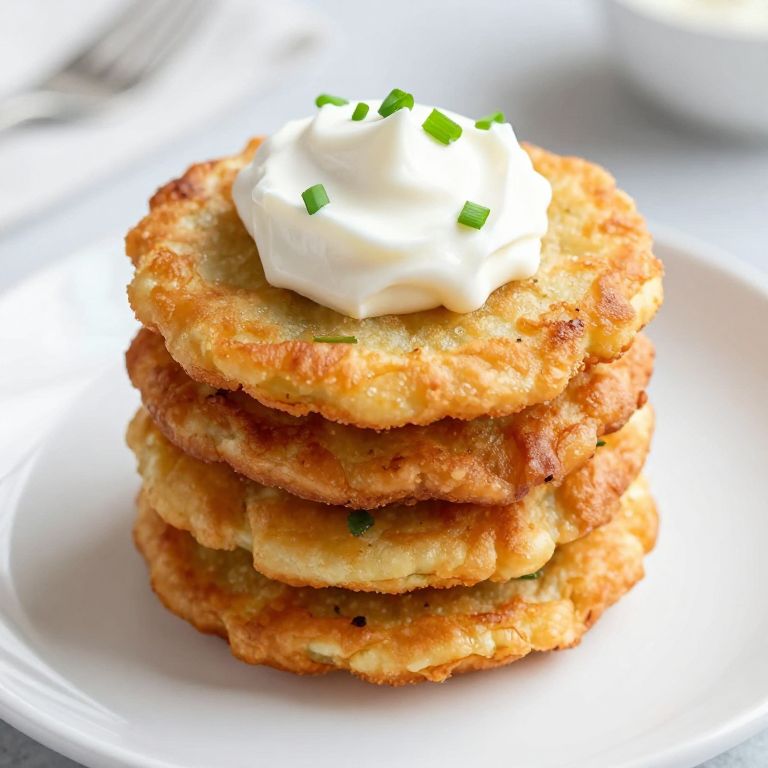 Golden fritters stacked four high on a white plate, topped with a dollop of creamy sour cream and garnished with fresh chives, ready to be savored.