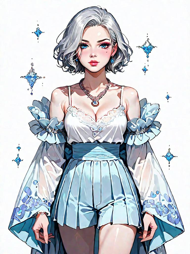 1girl, source_comics, realistic face, full body shot, Woman, bohemian, ivory crocheted lace tank top, square neckline, spaghetti straps, relaxed-fit pleated shorts, oversized sheer kimono with washed black dye, three-quarter dolman sleeves, layered silver bangle bracelets, simple thin chain necklace, white background