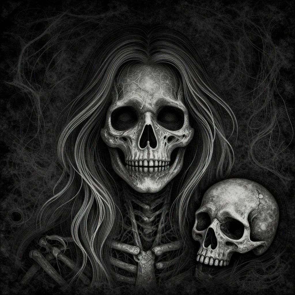 The image is a highly detailed etched print-style illustration, featuring a ghostly and eerie theme. The central figure is a woman with a skeletal face, her skin and features etched in a dark, intricate pattern that resembles a network of veins and bones. Her hair, also etched in a similar vein, flows around her face, adding to the ghostly appearance. To her right, a small skull is etched, further emphasizing the skeletal theme. The background is dark and textured, with a sense of depth and dimension, creating a sense of mystery and foreboding. The overall composition is balanced, with the woman's face and the skull positioned centrally, drawing the viewer's attention to the eerie and ghostly nature of the illustration.