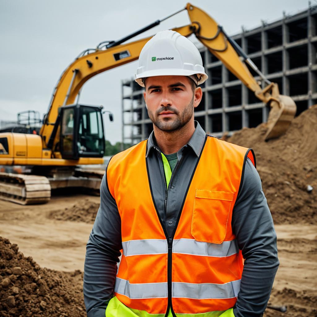 Construction working clothes, photorealistic, man, construction worker, standing, daytime, wearing orange safety vest with reflective stripes, yellow hard hat, gray long-sleeve shirt, concrete building in background, construction site, wooden beams, concrete walls, serious expression, natural light, realistic ures, construction industry, building in progress, standing in front of unfinished structure, construction worker uniform, modern construction, construction site worker, realistic detail, urban setting, professional appearance