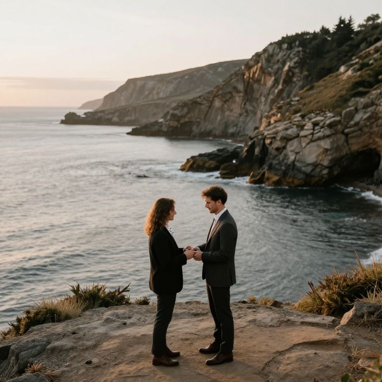 Couple exchanging vows in a serene coastal landscape, surrounded by rugged cliffs and expansive waters, embodying the essence of an intimate elopement.
