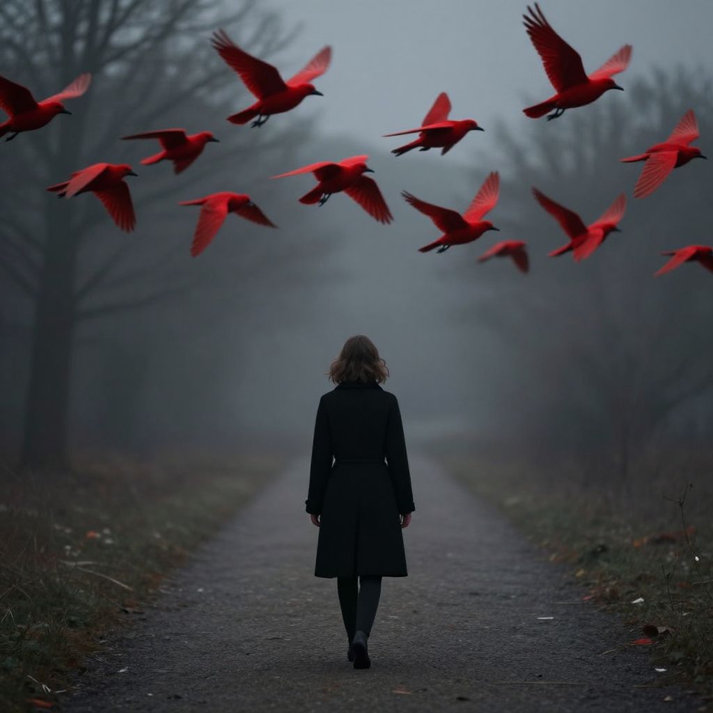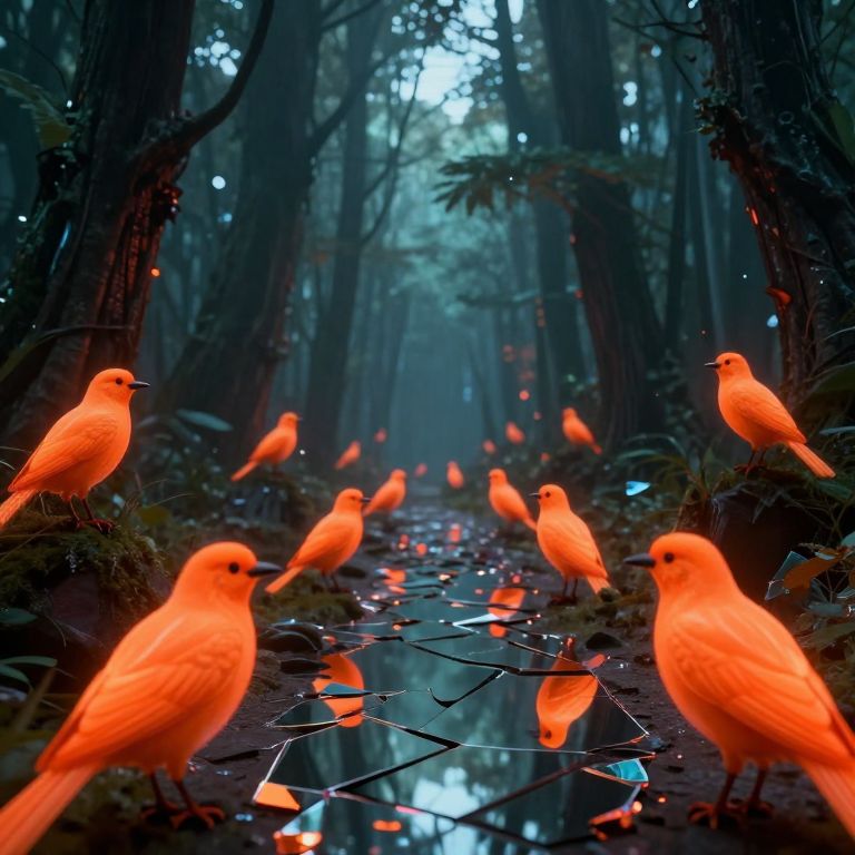 In a forest cloaked in twilight mist, neon-orange birds stand in silent procession along a mirrored path, their vibrant forms reflected endlessly, evoking a surreal dance between life and illusion, where the boundaries of reality blur into a dreamlike tapestry of wonder and mystery.