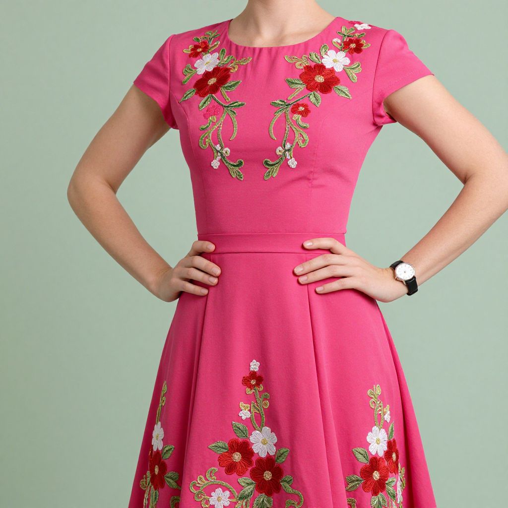 Woman wearing a vibrant pink 1950s-style dress adorned with intricate floral embroidery featuring red, green, and white patterns, paired with a black wristwatch and hands gracefully positioned on her hips against a soft green backdrop.