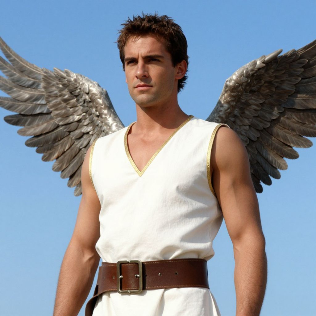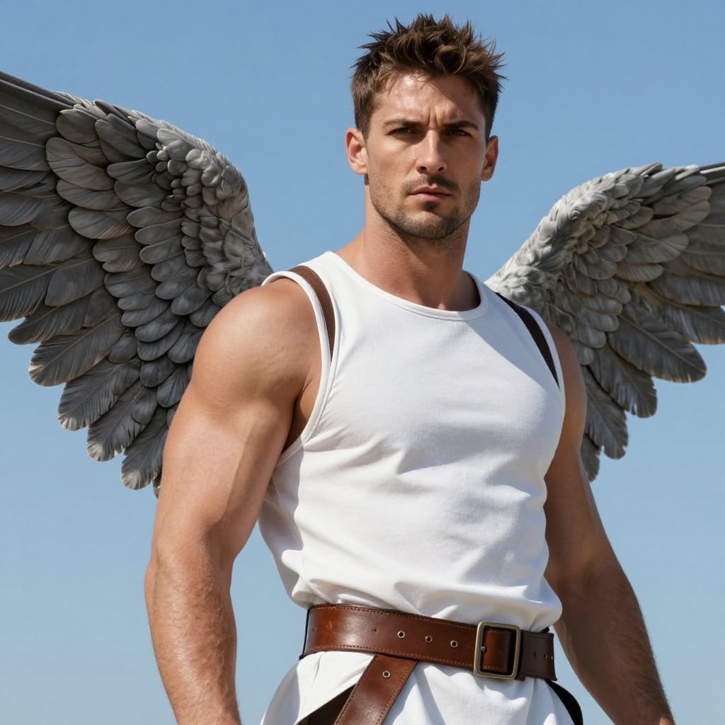 Photograph of a handsome, muscular man with short brown hair and intense expression, standing against a clear blue sky. He has large, gray-feathered angel wings on his back and wears a sleeveless white tunic with a brown leather belt. The sunlight highlights his strong, defined arms and the texture of his wings. He looks serious and powerful, with a slightly rugged, attractive appearance.