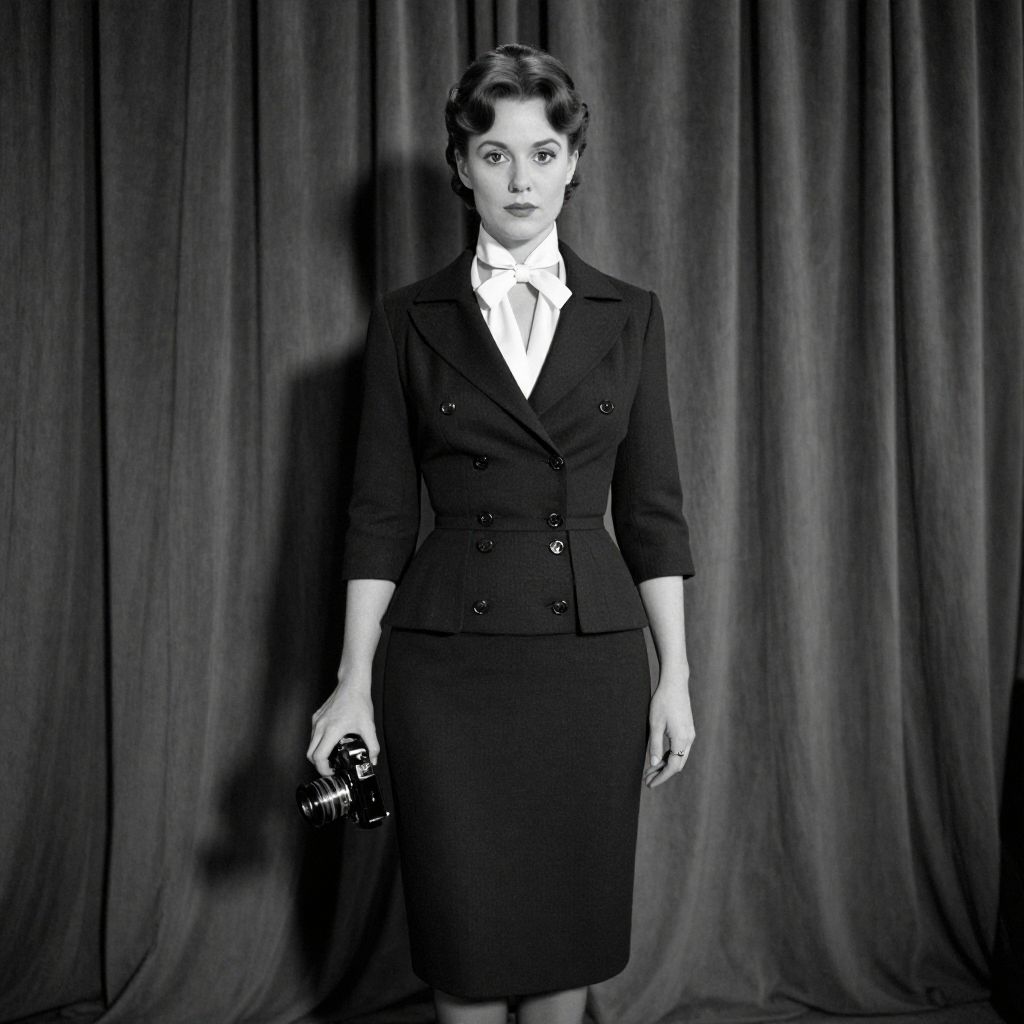Black-and-white photograph of a serious-looking woman in a 1940s-style black double-breasted suit, white shirt, and knee-length skirt,