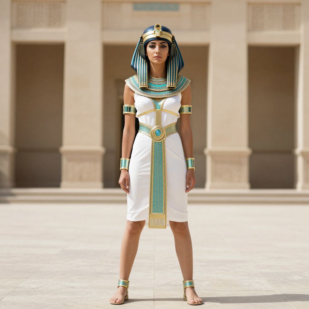 Egyptian warrior outfit, a woman in egyptian costume standing in front of a building