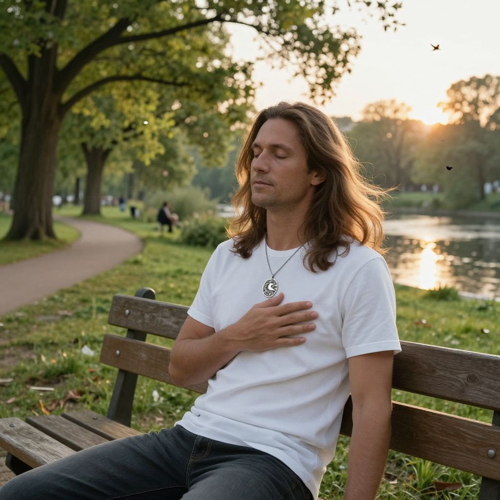 A calm, mid-30s man with long, flowing brown hair that cascades over his shoulders, wearing a simple white t-shirt and well-fitted dark jeans, sits peacefully on a wooden bench in a sunlit park. His eyes are gently closed, reflecting a sense of stillness and contentment. He gently rests a silver pendant necklace on his chest—its intricate, handcrafted design featuring delicate vines and a small moon motif—catching the soft morning light. The scene is serene, with lush green trees swaying slightly in the breeze, a quiet path winding through the grass, and a distant river shimmering with rippling reflections of the golden sunlight. Birds flutter in the background, and the air feels fresh and still, creating a peaceful, natural atmosphere that invites tranquility and reflection.