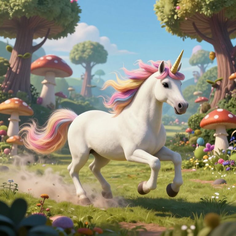 Digital artwork of a white unicorn with a flowing pink, yellow, and purple mane and tail, galloping through a vibrant, fantastical forest. The unicorn has a golden horn and expressive blue eyes. The background features large, red-capped mushrooms, lush green trees, colorful flowers, and a bright blue sky. Dust is kicked up beneath the unicorn's hooves. The scene is whimsical and enchanting, with soft, realistic textures and vibrant colors, creating a magical, storybook-like atmosphere.