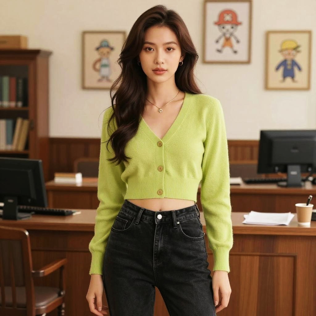 A woman, in a casual chic style with a cropped lime green cardigan and high-waisted black jeans, minimal jewelry, and long wavy hair, standing in a vintage courthouse office with antique furniture, illustrated in the visual style of One Piece. Sexy. Pretty face and beutiful eyes