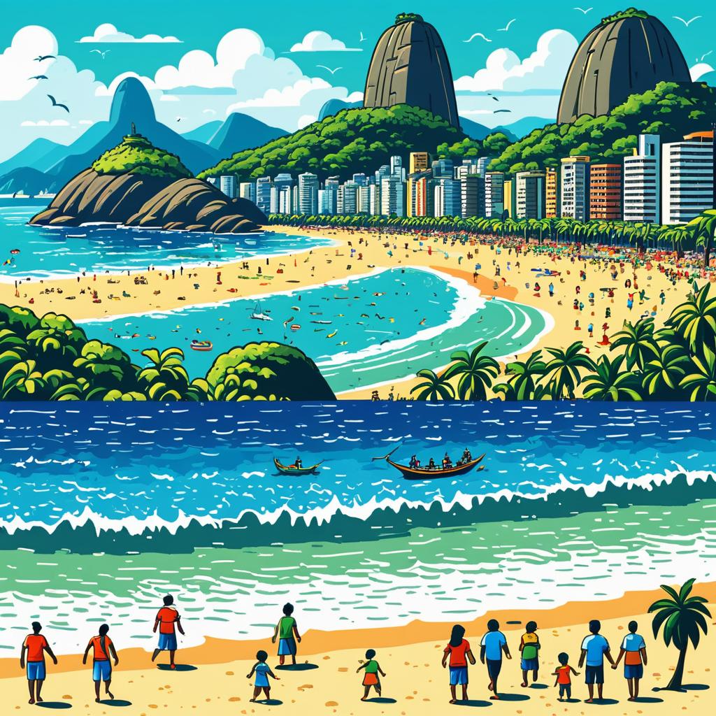 2D platformer sprite sheet of a colorful Rio de Janeiro beach scene, with vibrant colors and friendly design reflecting Brazilian culture, suitable for a cartoon game, featuring educational elements