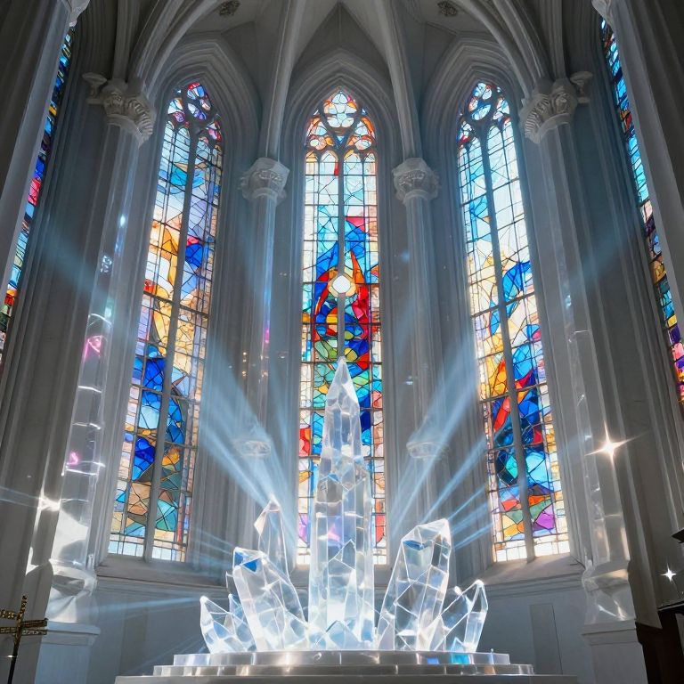 Photograph of an ornate, Gothic-style cathedral interior. Tall, arched stained glass windows with vibrant, multicolored patterns of blue, red, yellow, and green dominate the background. Bright, white, crystalline sculptures with geometric shapes are illuminated at the base, casting light beams upwards. The gray stone pillars and vaulted ceiling enhance the majestic, historical ambiance. The stained glass and illuminated sculptures create a striking contrast between traditional and modern elements.