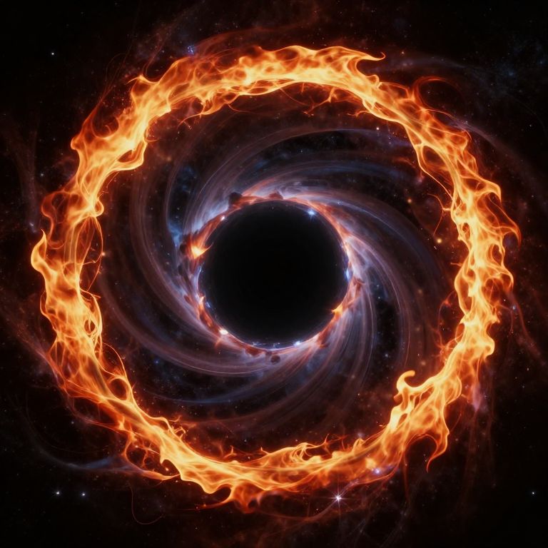 Digital artwork of a fiery, swirling vortex against a dark space background, with bright orange flames encircling a black void.