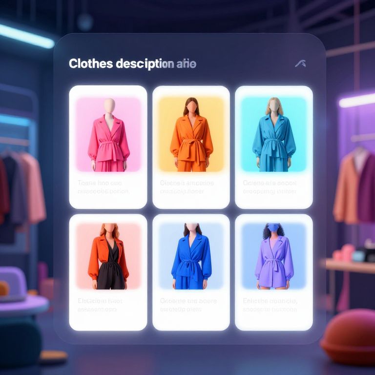 Clothes description generator interface, futuristic AI tool displaying vibrant clothing items with detailed text descriptions, sleek digital background, user-friendly design, soft glowing lights, high tech fashion workspace environment
