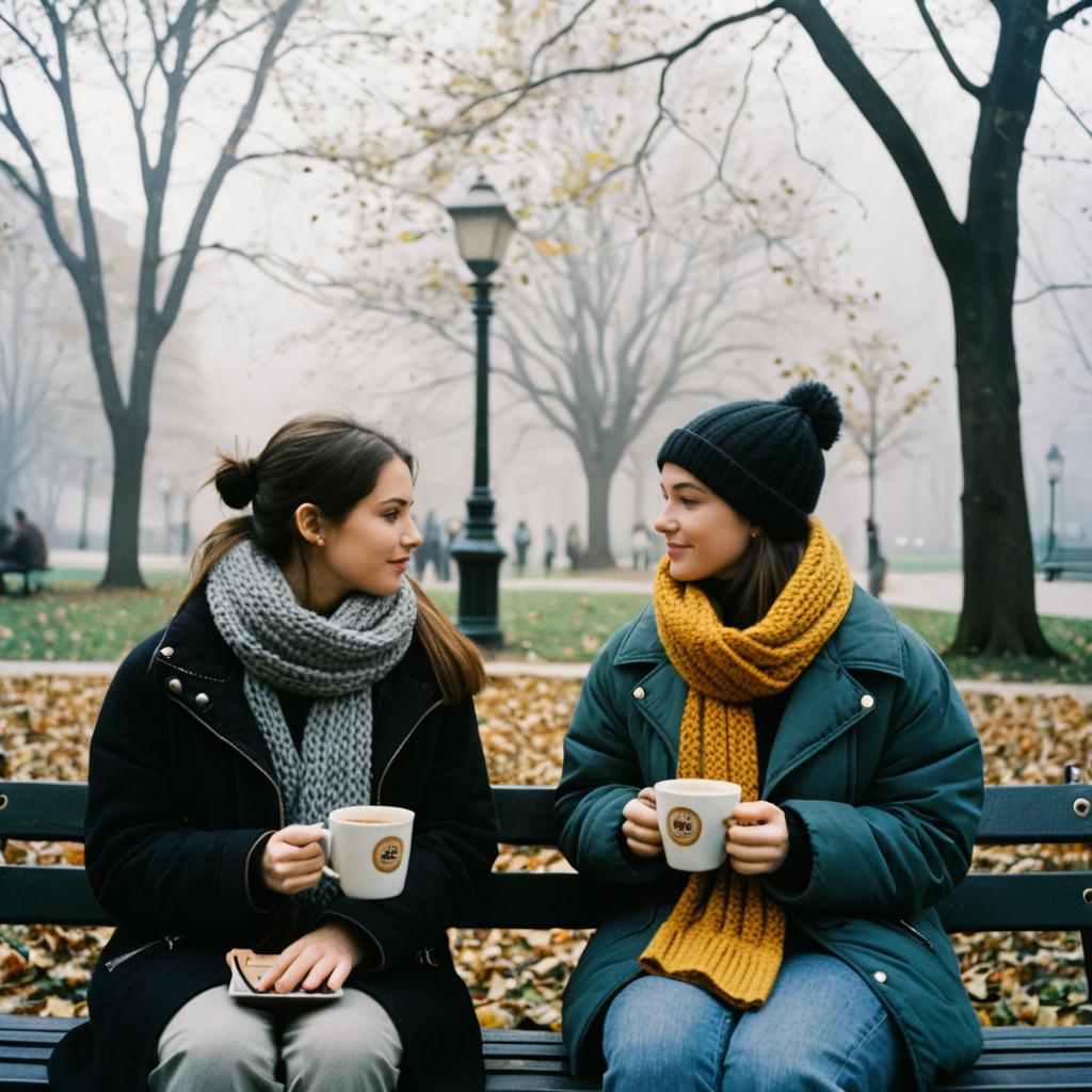 Kodak Portra cinematic film still of a pair of best friends sharing coffee, warm knitted scarves and jackets, clasping mugs, at a leafy city park bench during early morning fog, nostalgic and warm vibe.