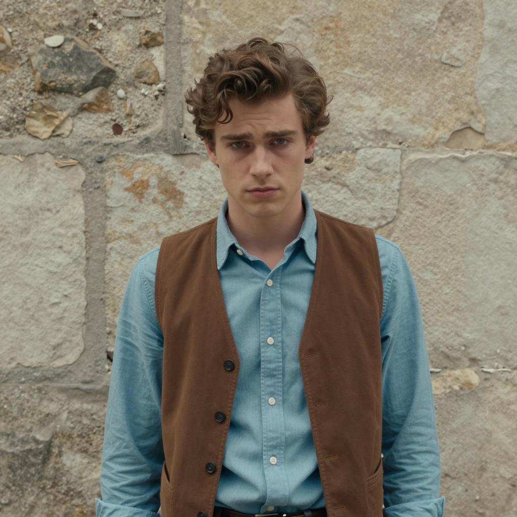 Close-up photorealistic portrait of a young man with curly brown hair, light brown eyes, and tan skin. He is wearing a beige collared shirt and has a neutral expression. The background consists of green outdoor foliage with natural light highlighting the detailed hair strands and realistic skin texture.