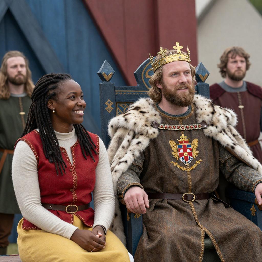 Photograph of a medieval-themed scene. Two main subjects: a smiling Black woman with dreadlocks in a red and yellow vest, and a bearded white man with light brown hair in a gold crown, fur-trimmed robe, and royal emblem. Background includes blue and red wooden structures, two other men in medieval attire. The man in the robe sits on a throne-like chair with blue and gold patterns. Natural light, outdoor setting.