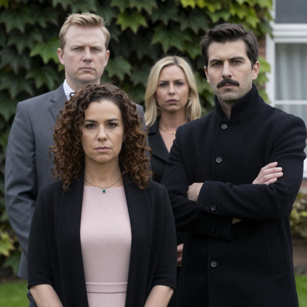 Photograph of four people outdoors. Female in front with curly brown hair, pink dress, black shawl, necklace, serious expression. Two males behind, blonde and dark-haired, serious expressions. Blonde female in middle, black coat, gold chain, serious expression. Dark-haired male on right, black coat, mustache, serious expression. Green ivy background, white window. Sturdy, formal attire. Stances close, arms crossed.