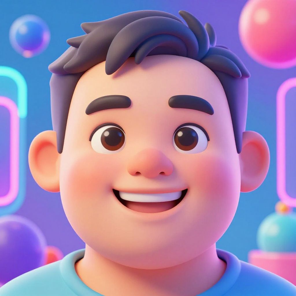 AI fat filter applied to a vibrant digital portrait of a smiling person, emphasizing soft, exaggerated facial features with a playful and colorful background in a futuristic art style, full of glowing neon lights and smooth textures.