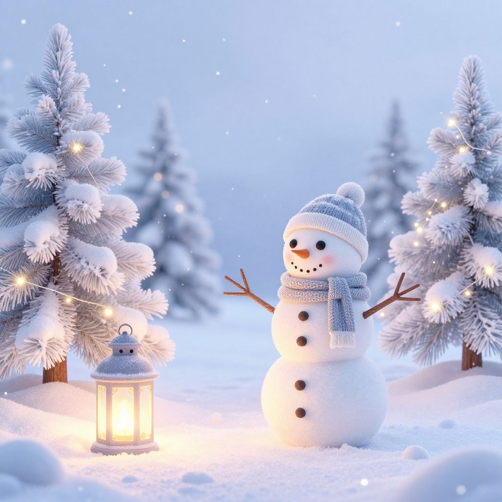 Snowman aesthetic wallpaper featuring a cozy winter scene with soft snowfall, warm glowing lanterns, and a charming snowman wearing a knitted scarf and hat, surrounded by frosted pine trees and twinkling fairy lights, in pastel colors.