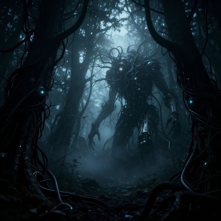 Creepy digital art illustrating a nightmarish cybernetic forest where twisted wires and metal branches merge, glowing sinister eyes peer from the shadows, fog illuminated by cold artificial light, a haunting fusion of technology and nature